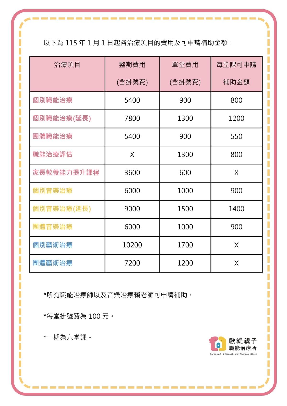 - 本所會依據孩子的需求及家長主訴來提供不同形式的課程,皆為一期六堂(一次收取整期費用),除了評估為單次計費。